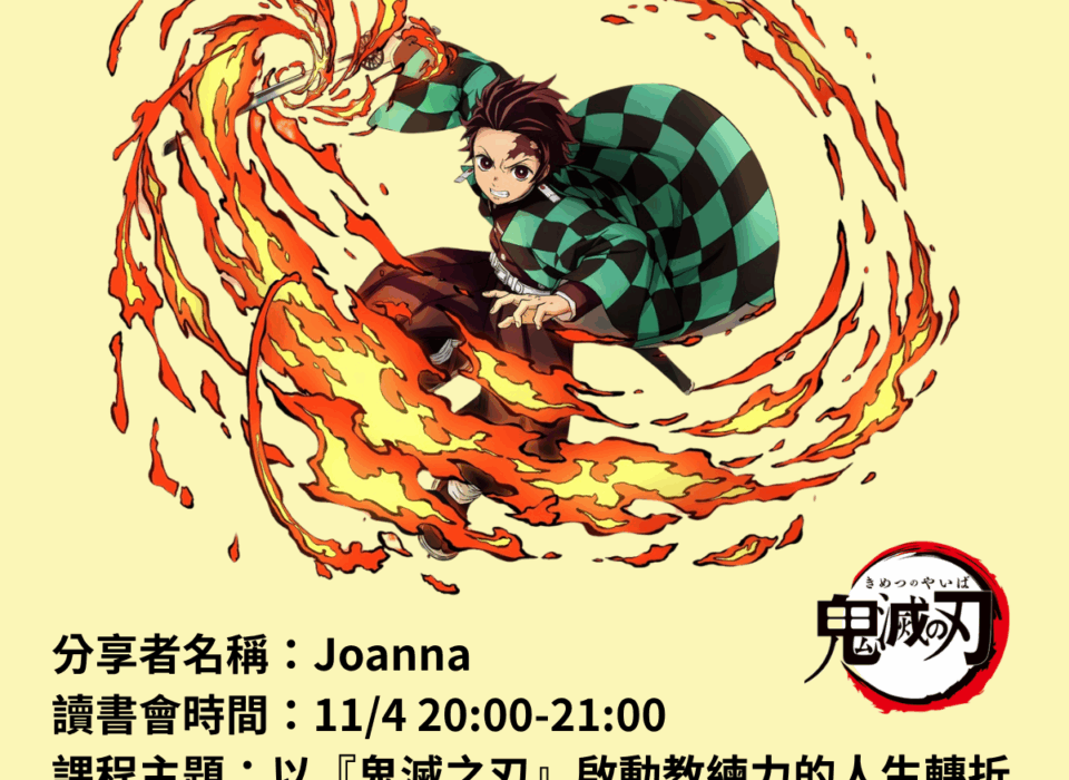 分享人:Joanna 時間:11/4 (二) 20:00-21:00 書名:以『鬼滅之刃』啟動教練力的人生轉折……