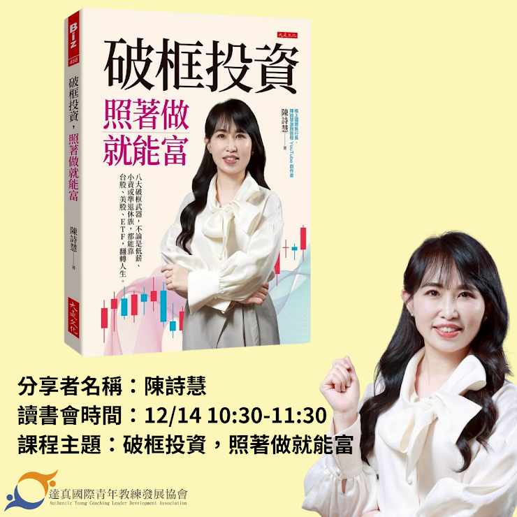 12/14《破框投資,照著做就能富》 22 10 月, 2025 by spamber 這場讀書會,不只是我一個人的故事,而是我們共同見證「破框」的力量: 從投資出發,走進人生,投資不是冷冰冰的數字,而是人生的縮影。 如何在人生的危機中突圍? 如何在投資的迷宮中找到出口? 如何打造出屬於我自己的「人生投資地圖」? 這是不用讀書的讀書會,來和我們一起聽聽故事,聊聊人生🤩 報名讀書會